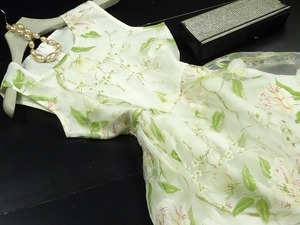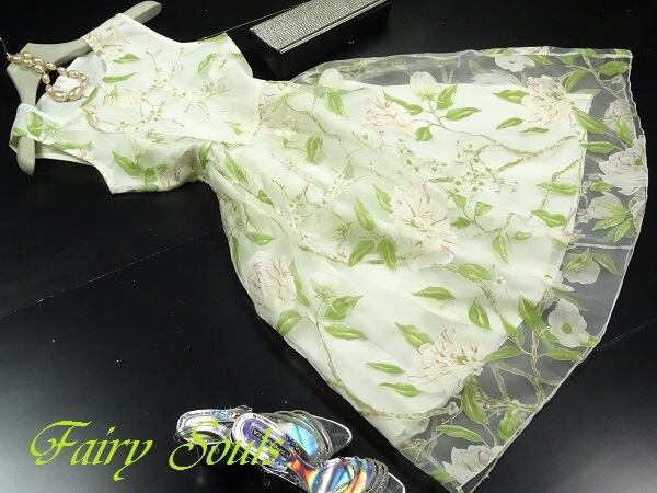 花模様のレース仕立ての膝丈ノ-スリ-ブワンピース。白の下地の上に、花模様をプリントしたレースをかぶせていて、薄い透け感がやわらかな印象を与えてくれています。大きなラウンドネックにノースリーブも全体の中でバランスが良く、ピュアでフェアリーなデザインになっています。煌めく太陽の光の中でも、また新緑の爽やかな風の中でも、着る人を美しく魅せてくれる一着です。裏地有り。背中ファスナー有。
