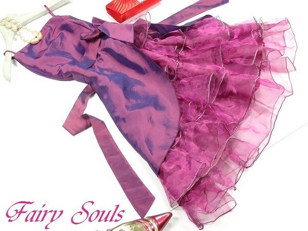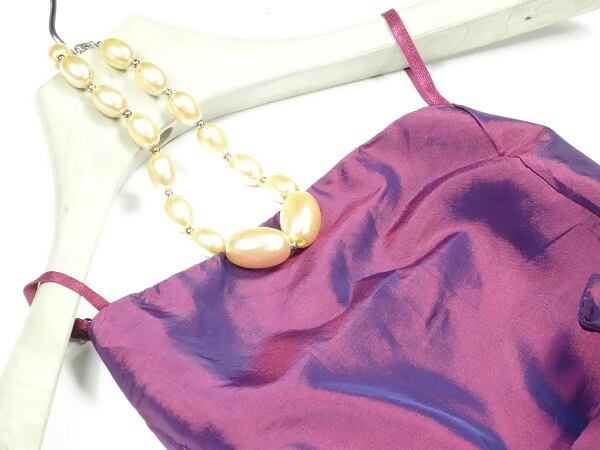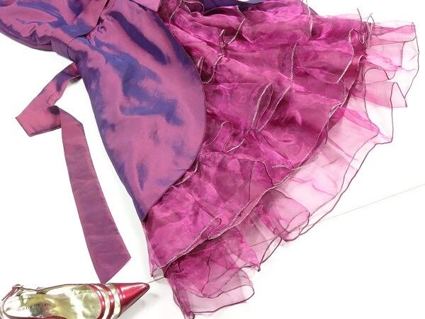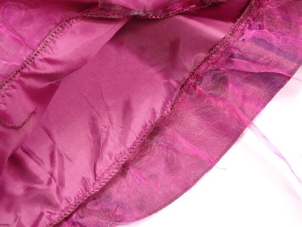 艶やかなサテンとオーガンジーが豪華なミニドレス。フィットした胸元に、きゅうと絞ったウエスト。大きなウエストリボンの下から裾にかけてサテン生地が斜めにカットされ、たっぷりとしたフレアのオーガンジーが華やかな印象を与えています。伸縮性なし。裏地なしですが透け感はありません。右サイドファスナー有。