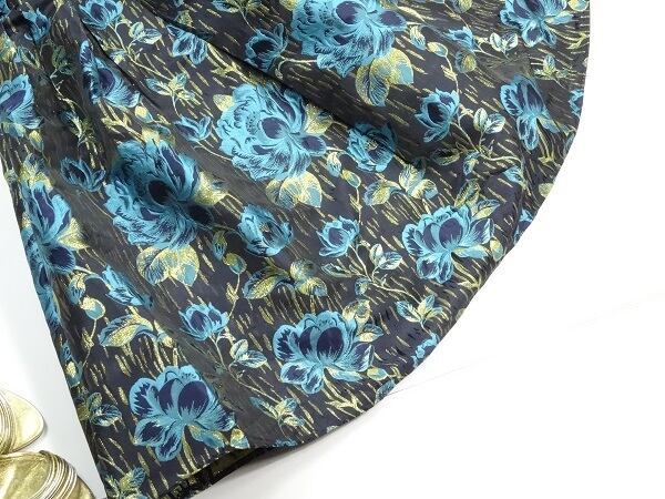 花柄ゴ-ルド刺繍フレア-ワンピ-スです。ゴ-ルドとブル-の花柄刺繍がとても素敵で上品かつ豪華で飽きのこない着まわせる一着です。裏地有。背中ファスナ-有。