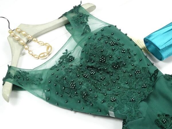 クル-ネックノ-スリ-ブシフォンショ-トドレスです。フロントの透け感と綺麗な飾りがセレブリティ-な雰囲気でウエストからシフォン素材が広がりとても美しく魅せてくれます。裏地有。背中ファスナ-有。