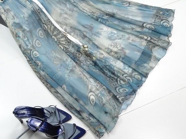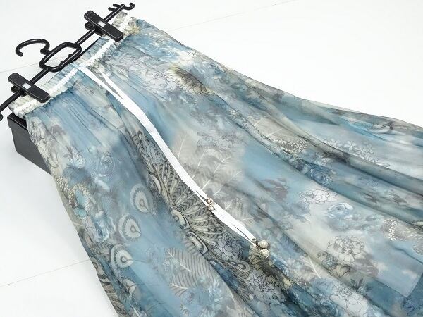 花柄プリントシフォンフレア-スカ-トです。ブル-系にとても美しい花柄プリント模様のシフォンが歩くたびにふんわりと揺れる魅力的なシルエット。リゾートコーデにも最適です!ウエストゴム仕様で伸縮性あり。裏地付。