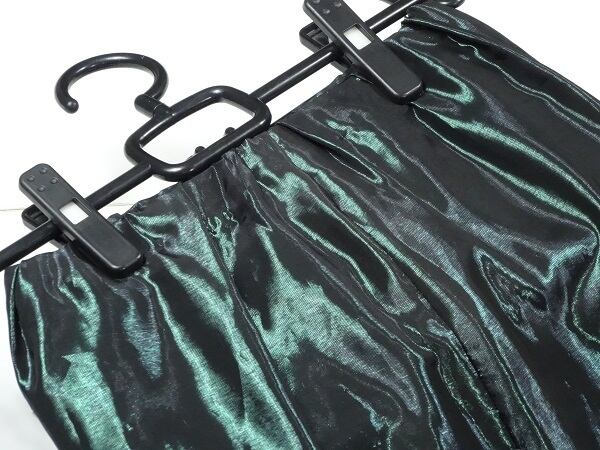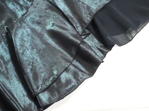 社交ダンスに最適なロングスカートです。黒地にメタリックグリ-ンの光沢色がとても綺麗で光の当たる角度によりいろんな表情を見せてくれる一着です。華やかで上品な印象をあたえています。ウエストは総ゴム仕様でサイズにゆとりがあります。裏地有。後ろファスナ-・ホック有。