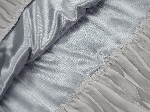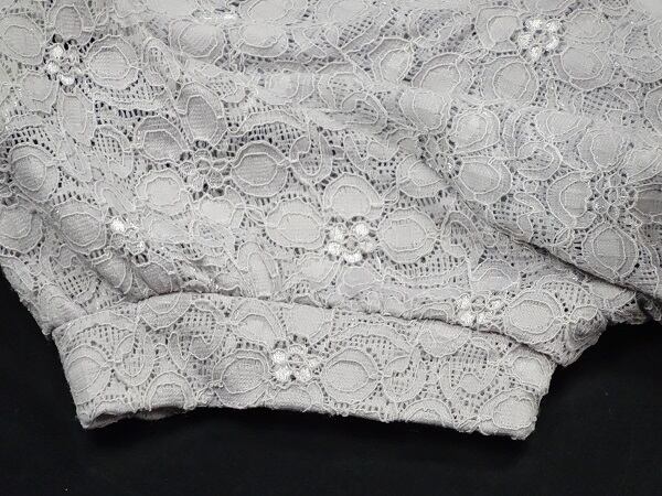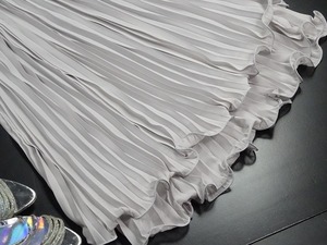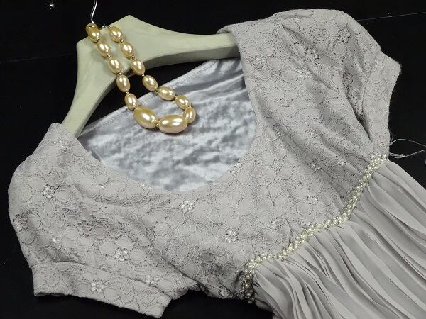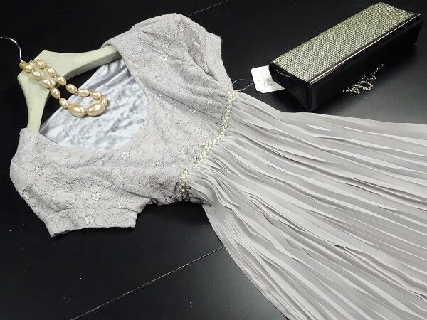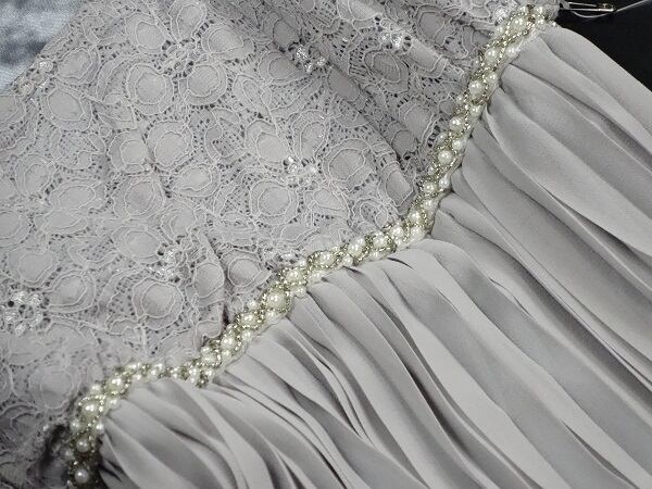 ウエストビジュー飾りレースとプリーツのワンピース。深いラウンドネックと可愛い袖が魅力的なレース仕様のトップス。ハイウエストにはフェイクパールと金のビーズをあしらってアクセントに。シックなグレーのシフォン地をたっぷりとったプリーツは、ウエストから裾までゆったりと流れエレガントな印象に。軽い着心地で動くたびに揺れる裾がとても魅力的な一着です。周りの目をくぎずけにすること間違いないでしょう。ウエストゴム仕様で伸縮性あり。ファスナーなしのかぶるタイプ。裏地付。