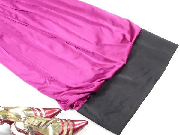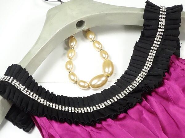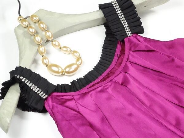 フェミニンなノ-スリ-ブワンピースです。ワインレッドの光沢感がとても綺麗でお洒落度バツグンの女性らしさを演出した一品です。裏地なし。ファスナ-なし(かぶるタイプ)。