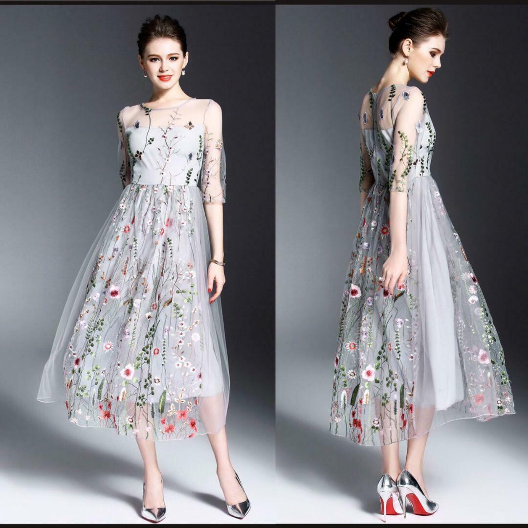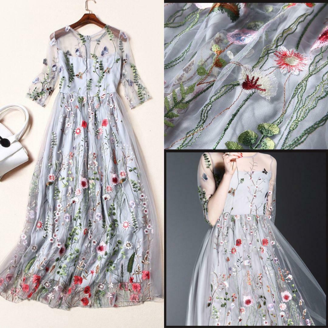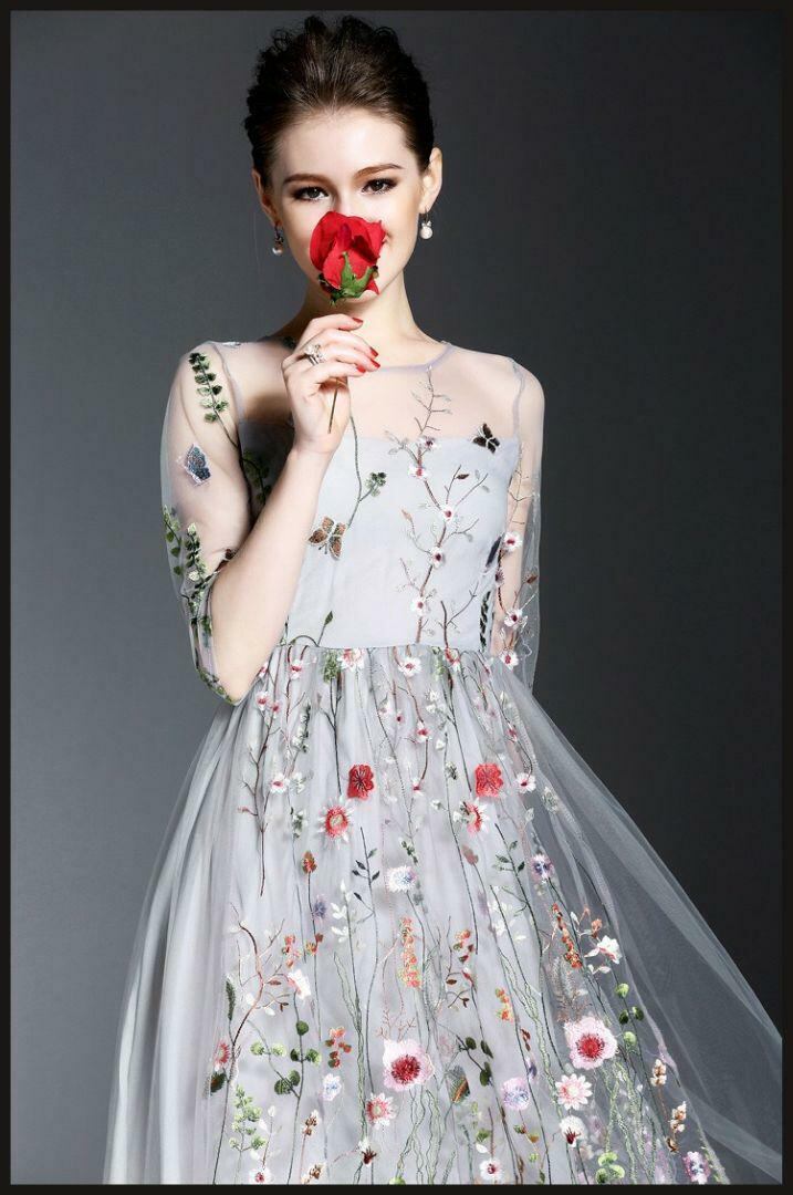 トレンド刺繍花柄チュ-ルマキシ丈ワンピ-スです。トレンド感たっぷり色の美しいエレガントなワンピ-スです。デザイン性のあるスタイルがとても魅力的な一着です。可愛いデザインで全体的に優しい感じに仕上げられています。背中ファスナ-有。裏地有。