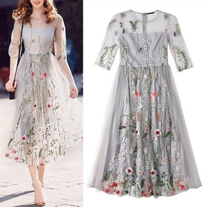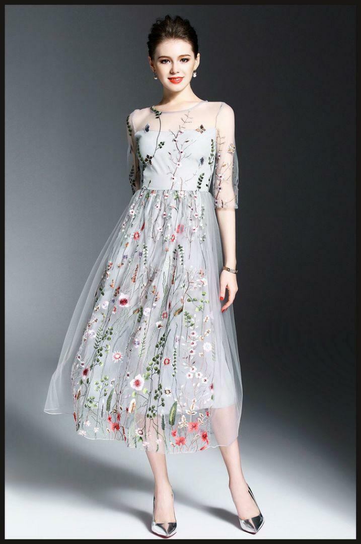 トレンド刺繍花柄チュ-ルマキシ丈ワンピ-スです。トレンド感たっぷり色の美しいエレガントなワンピ-スです。デザイン性のあるスタイルがとても魅力的な一着です。可愛いデザインで全体的に優しい感じに仕上げられています。背中ファスナ-有。裏地有。