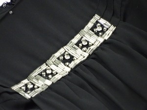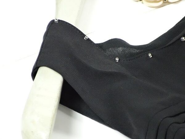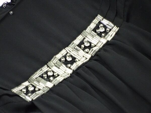 胸元の飾りがフェミニンなワンピースです。お洒落度バツグンで女性らしさを演出した一品です。裏地付。背中ファスナ-有。