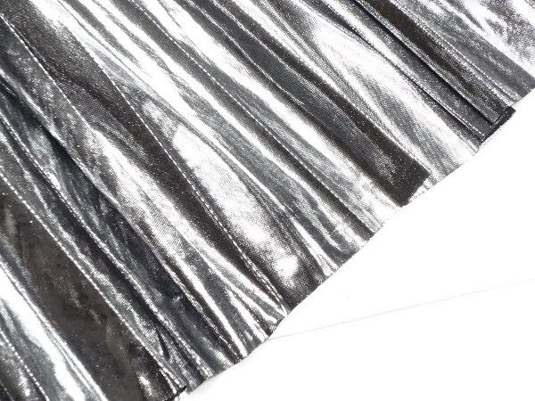 メタリックシルバ-の光沢プリ-ツスカ-トです。光沢の輝きがとても綺麗で歩くたびの揺れ感がプリ-ツならではでとても女性らしくまるで女優になった気分にさせてくれます。大人のエレガンスさを感じさせてくれるデザインです。裏地あり。