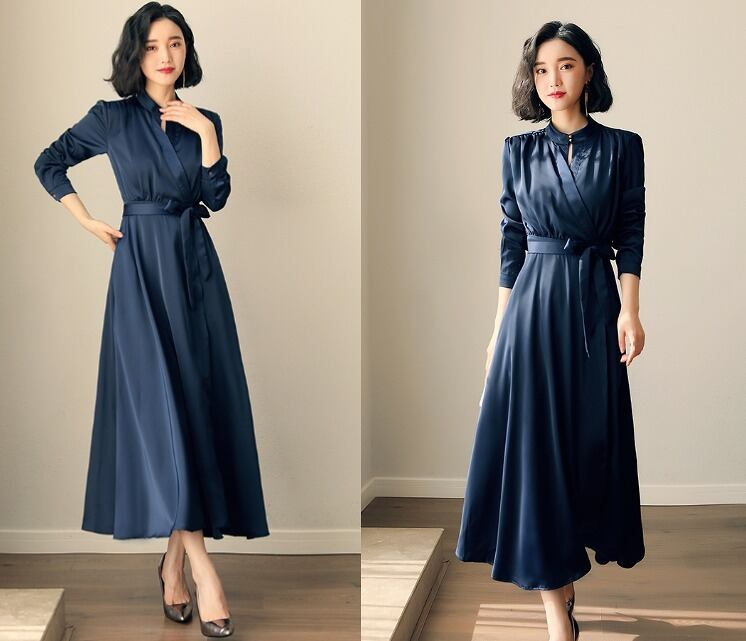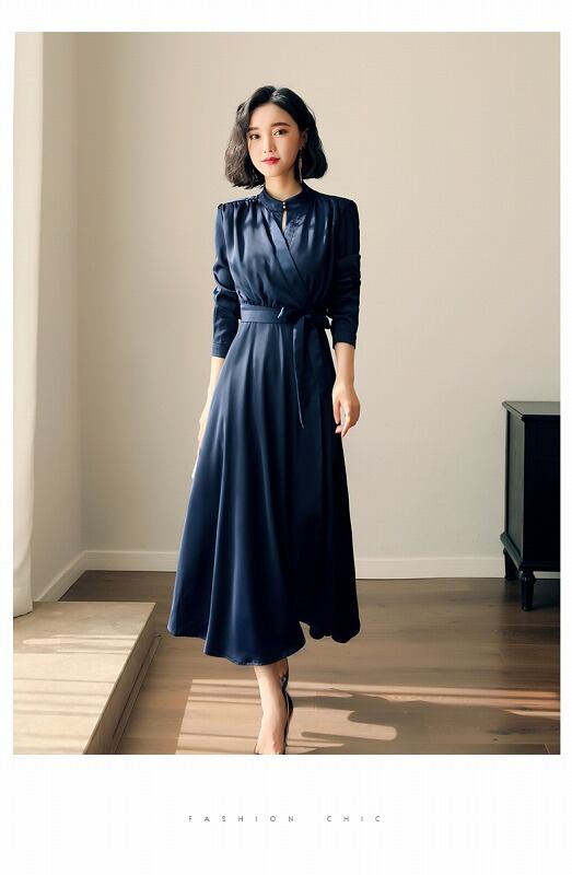 スリムレ-スアップ引き紐ワンピースです。前の腰あたりで同布ベルトで結ぶタイプ(縫い付け)です。スタイル良くスリムに見せてくれシックで上品な大人の女性を表現してくれています。パーティやイベント、コンサート、結婚式にと、さまざまシーンで活躍してくれる大人の一着。ファスナーなし(前での紐結びタイプ)。裏地なし。