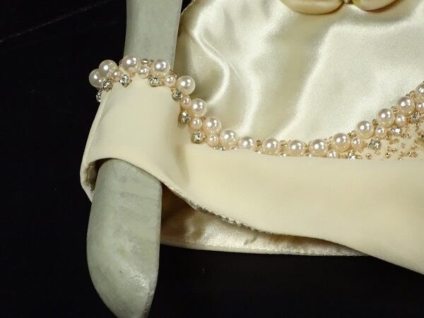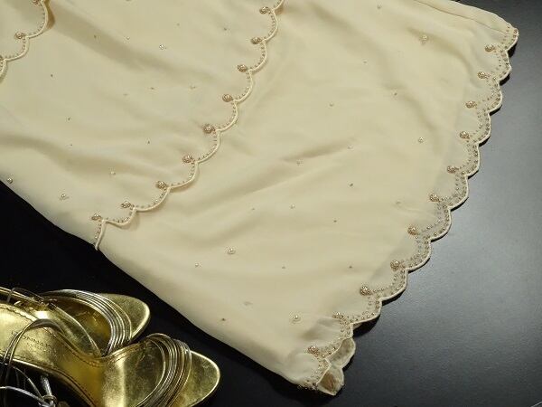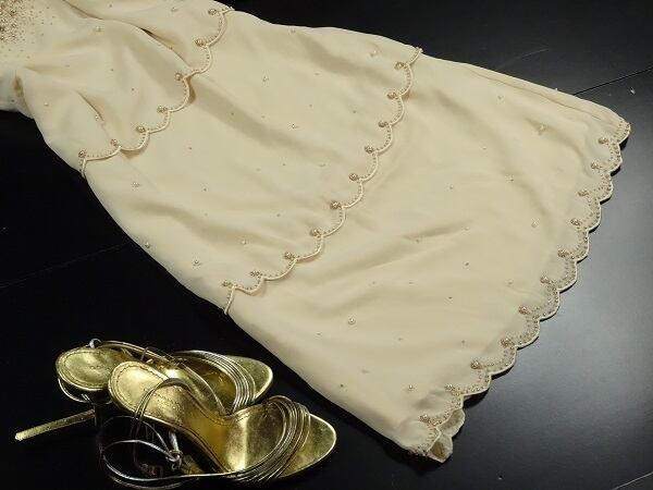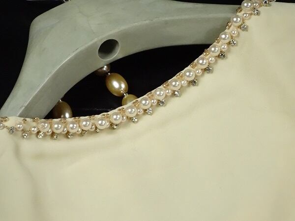 三段フリルデザインとパ-ル飾りが素敵なワンピ-スです。首回りと全体にフェイクパ-ルが散りばめられ段フリルがとても女性的です。左脇下ファスナ-有。裏地有。