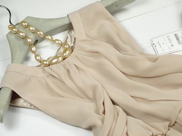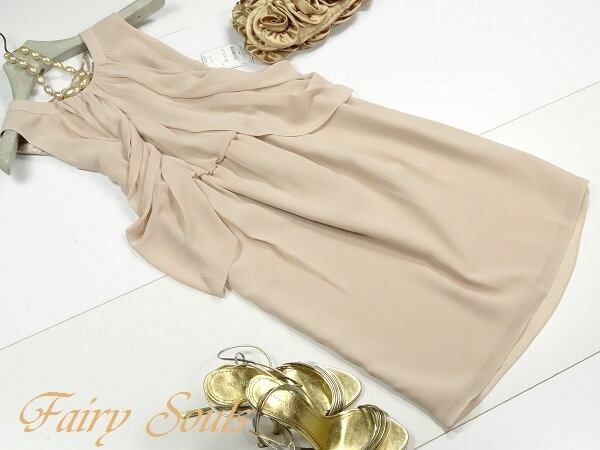 シックなドレープが美しいワンピース。落ち着いたベージュのシフォン地を、襟元からウエストにかけてたっぷりドレープをとり、優雅な流れを作っています。ウエストはゴム仕様で伸縮性があります。しなやかなシフォンが上品でエレガントで魅力的な一着です。結婚式や謝恩会などに。背中ファスナー有。裏地あり。