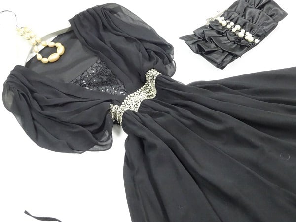 シックなドレープが美しいワンピース。しなやかな深い大人の黒地に、胸元から覗くレースには黒のスパンコールが縫い込まれており、ウエストにはスクエア型のビジューと竹ビーズで華やかさをプラス。ノースリーブの袖から流れるたっぷりとしたドレープがエレガントな印象を醸し出しています。結婚式、コンサート、パーティにと、どんなシーンにも溶け込む上品でエレガントで魅力的な一着です。左脇下ファスナー有。裏地あり。!!