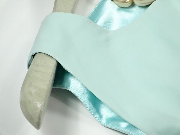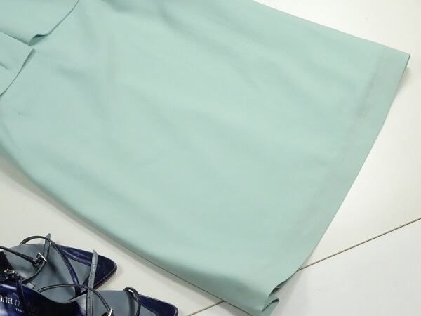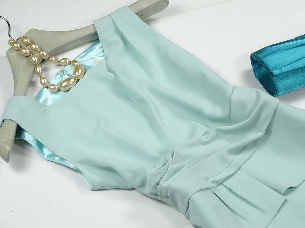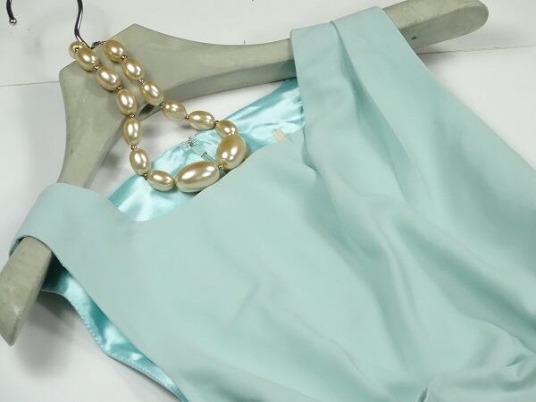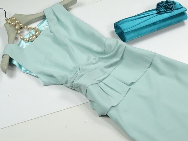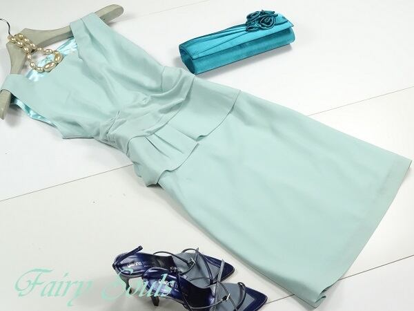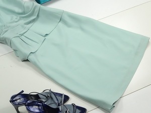 さわやかなブルーグリーンのペプラムタイプのワンピース。生地はしなやかで、スクエアカットの襟ぐりは首筋を美しく見せてくれます。ウエストはかわいいフリルがあしらわれたペプラムタイプで、どこか知的でエレガントな印象を醸し出しています。結婚式、コンサート、パーティにと、どんなシーンにも溶け込む優雅で上品、魅力的な一着です。背中ファスナー有。裏地あり。!!