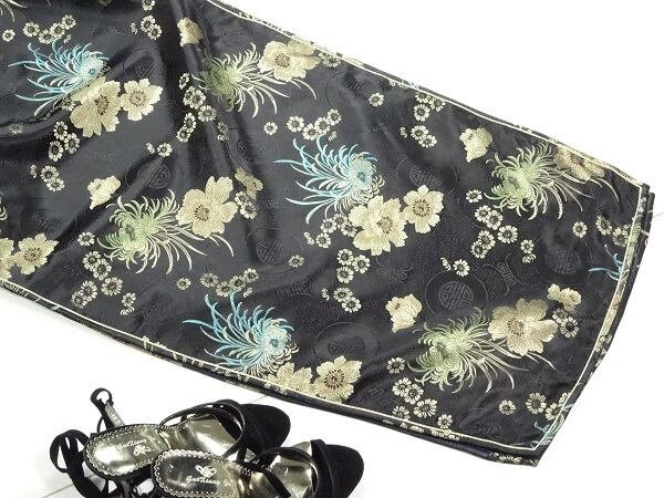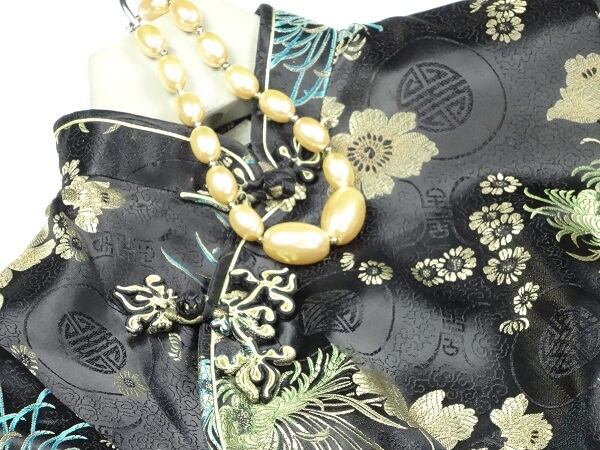 金糸・青糸刺繍ロングチャイナドレスです。黒地にゴ-ルドとブル-の刺繍がとても豪華で綺麗な一着です。スリムな大人の女性を醸し出してくれる一着です。裏地あり。右サイドファスナ-有。両サイド58cmのスリット有。
