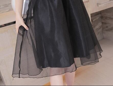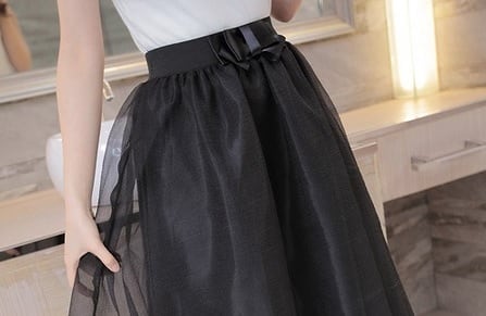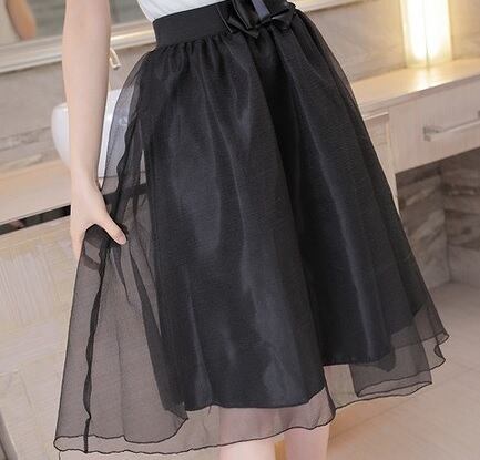 シンプルなふんわりチュ-ルの膝丈スカ-トです。前のウエストリボンがとても可愛いです。ファスナ-なし。裏地付。