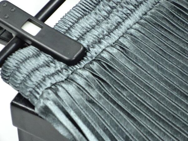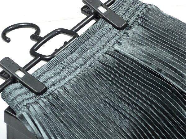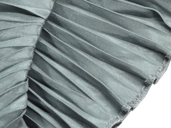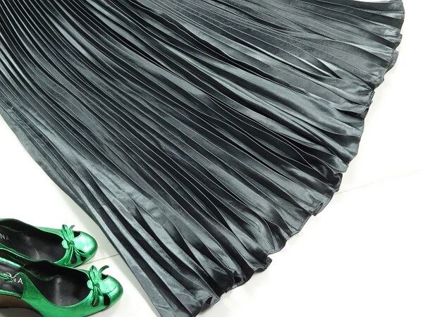 メタリックダークグリ-ンの光沢プリ-ツロングスカ-トです。光沢の輝きがとても綺麗で歩くたびの揺れ感がプリ-ツならではでとても女性らしくまるで女優になった気分にさせてくれます。大人のエレガンスさを感じさせてくれるデザインです。裏地なし。ファスナ-なし(ウエストはゴム仕様)。