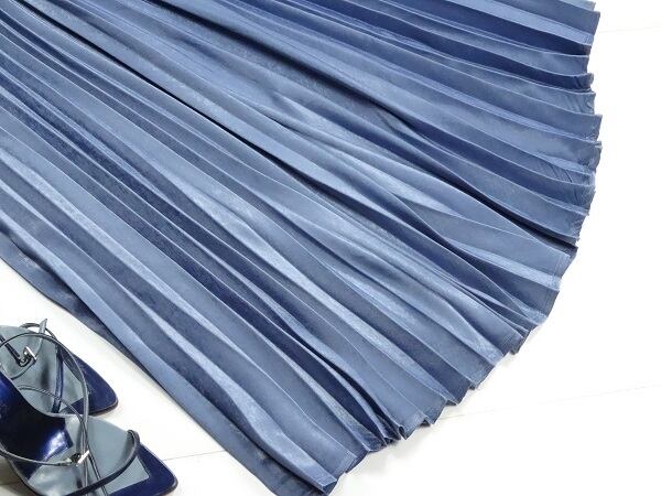 メタリックダークブル-の光沢プリ-ツロングスカ-トです。光沢の輝きがとても綺麗で歩くたびの揺れ感がプリ-ツならではでとても女性らしくまるで女優になった気分にさせてくれます。大人のエレガンスさを感じさせてくれるデザインです。裏地なし。ファスナ-なし(ウエストはゴム仕様)。