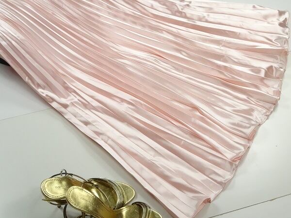 メタリックピンクの光沢プリ-ツロングスカ-トです。光沢の輝きがとても綺麗で歩くたびの揺れ感がプリ-ツならではでとても女性らしくまるで女優になった気分にさせてくれます。大人のエレガンスさを感じさせてくれるデザインです。裏地あり。