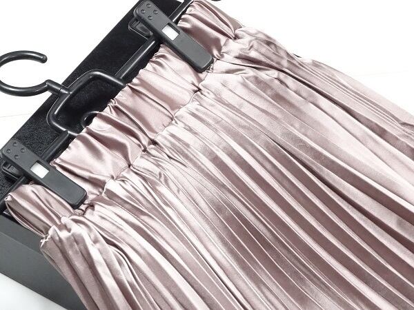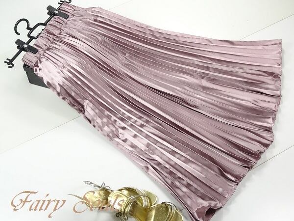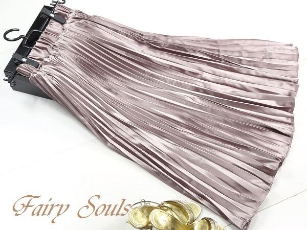メタリックピンクゴールドの光沢プリ-ツロングスカ-トです。光沢の輝きがとても綺麗で歩くたびの揺れ感がプリ-ツならではでとても女性らしくまるで女優になった気分にさせてくれます。大人のエレガンスさを感じさせてくれるデザインです。裏地あり。