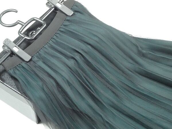 リバ-シブルアコ-ディオンプリ-ツスカ-トです。黒のチュ-ルを外側にするか緑のサテンを外側にするかの二通りの着方ができます。動くたびに揺れるエレガントなスカ-トです。女子力UP間違いなしとおもいます。ファスナ-なし。