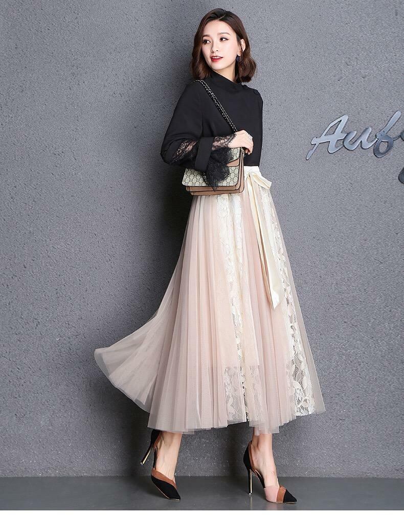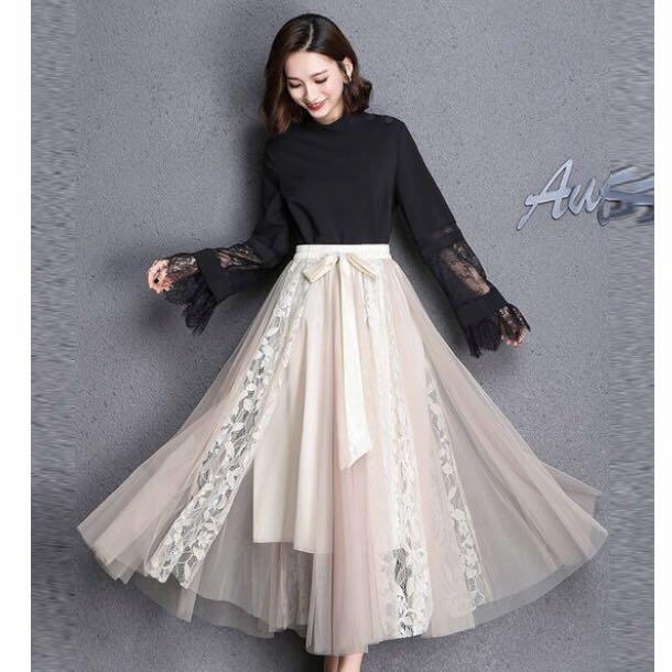 チュ-ルマキシ丈フレア-スカ-トです。前でリボンベルトを結ぶようになっています。生地が十分に使われていますのでエレガントで揺れ感も素敵です。!ウエストは総ゴムです。裏地有。ファスナ-なし。