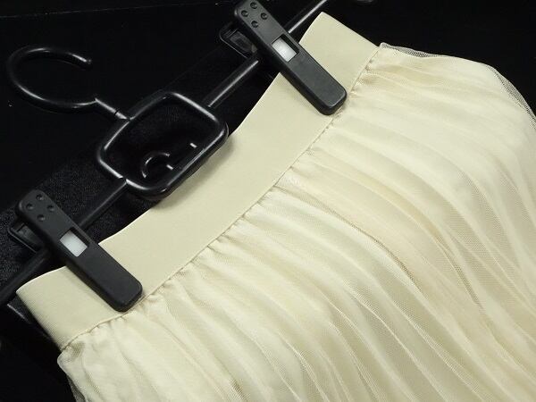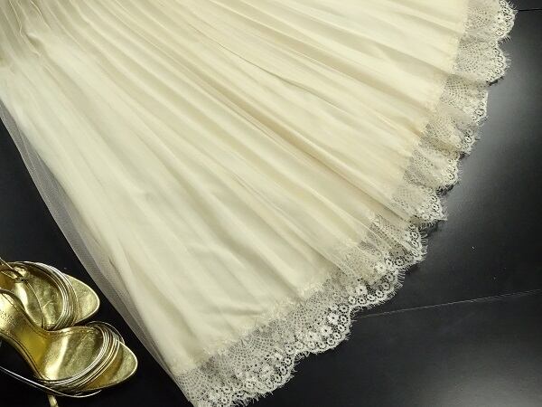 Aラインチュ-ルプリ-ツスカ-トです。中生地のプリ-ツのその上にチュ-ルを重ねエレガンスさを感じさせてくれるデザインです。裏地なし。
