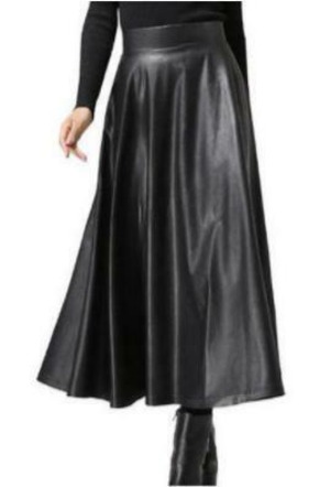 シンプルデザインフェイクレザーフレア-ロングスカートです。ロング丈の広がるフレア-が女性らしくフォ-マルやカジュアルまたパ-ティ-などにもお勧めです。。後ろファスナー有。裏地なし。