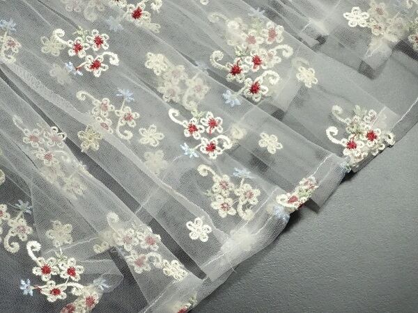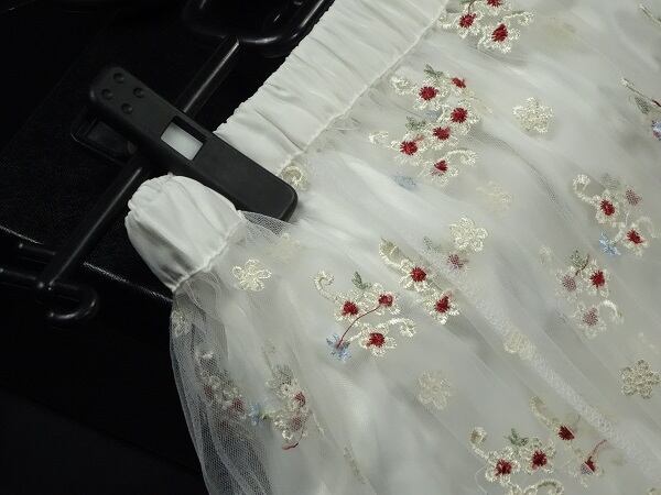 立体花刺繍チュ-ルマキシ丈フレア-スカ-トです。透け感がほどよく女性らしさを醸し出してくれます。刺繍も全体に施されとても素敵です。ファスナ-なし。ペチコ-ト付。