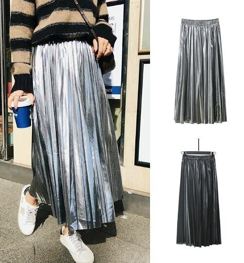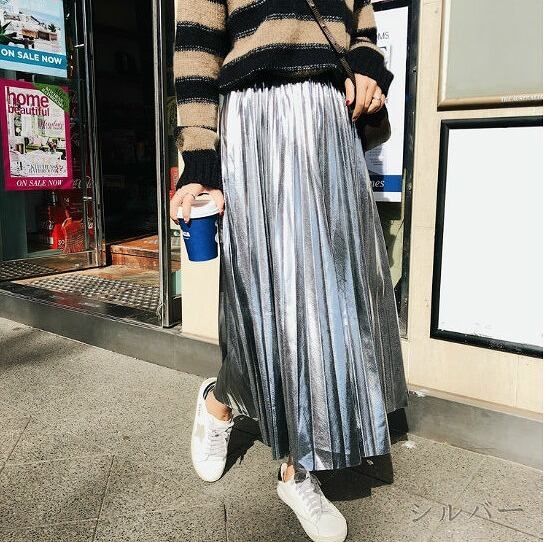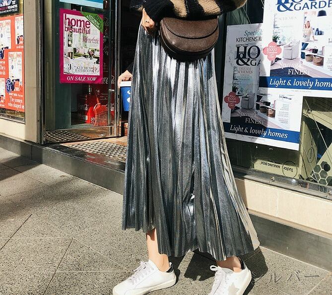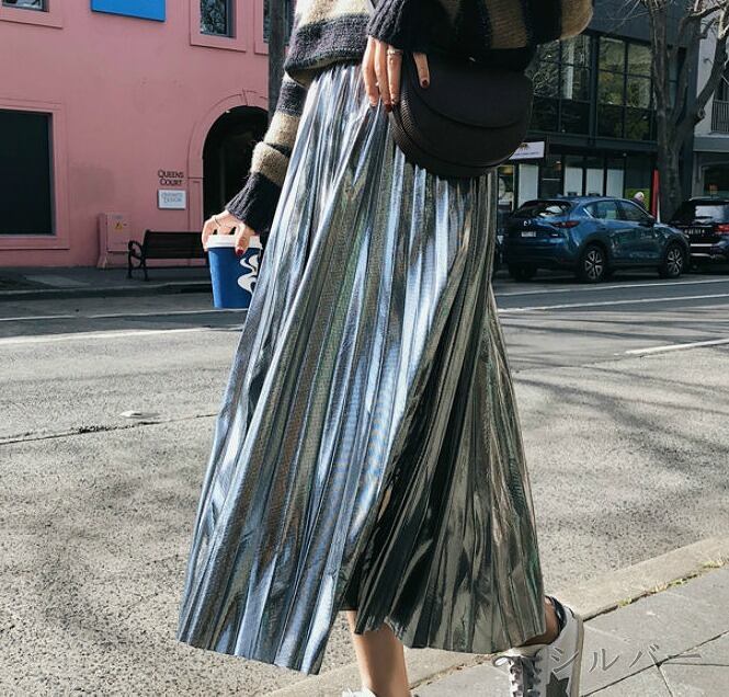 光沢メタリックシルバ-ロングプリ-ツスカ-トです。しわになりにくく動くたびに揺れるエレガントなプリ-ツスカ-トです。ファスナ-なし(ウエストゴム仕様)。裏地なし。