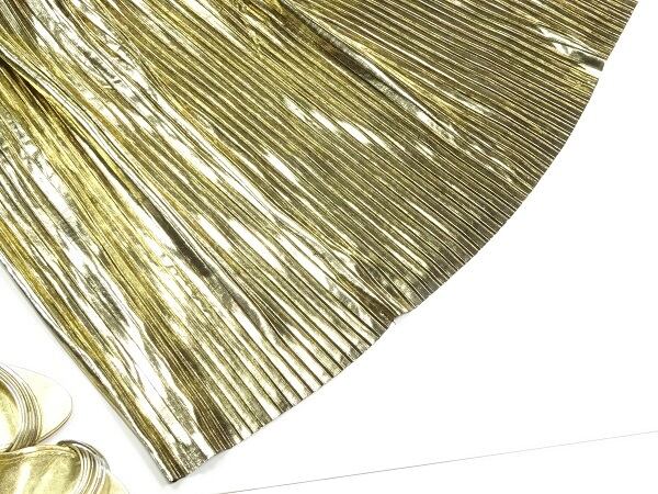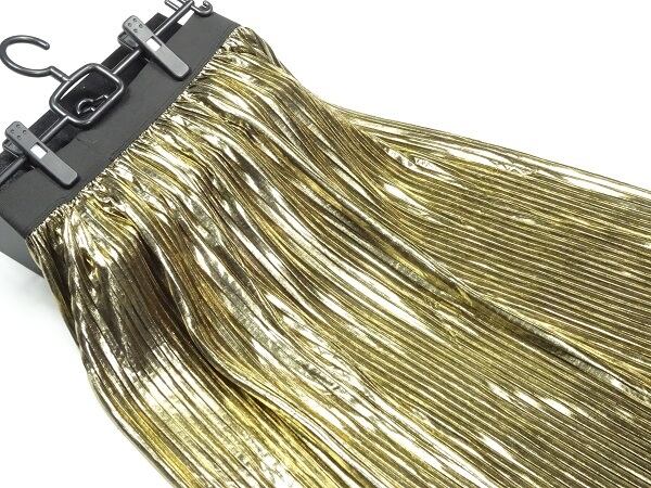 光沢メタリックゴ-ルド膝丈プリ-ツスカ-トです。しわになりにくく動くたびに揺れるエレガントなプリ-ツスカ-トです。ファスナ-なし(ウエストゴム仕様)。裏地なし。
