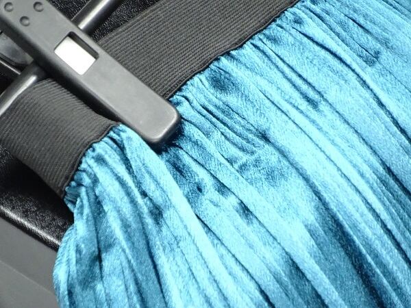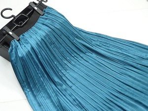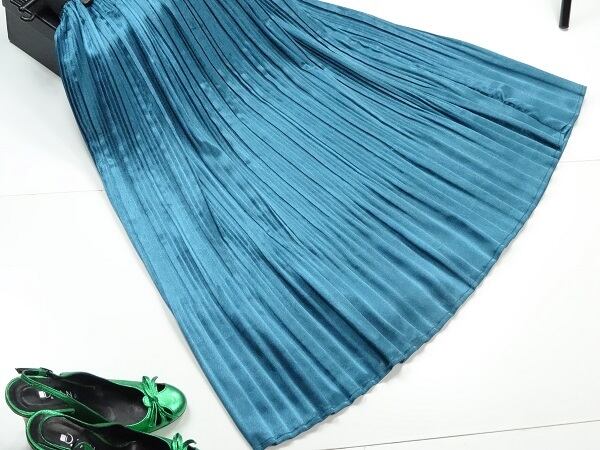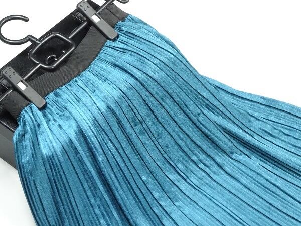 光沢メタリックブル-グリ-ン系膝丈プリ-ツスカ-トです。しわになりにくく動くたびに揺れるエレガントなプリ-ツスカ-トです。ファスナ-なし(ウエストゴム仕様)。裏地なし。