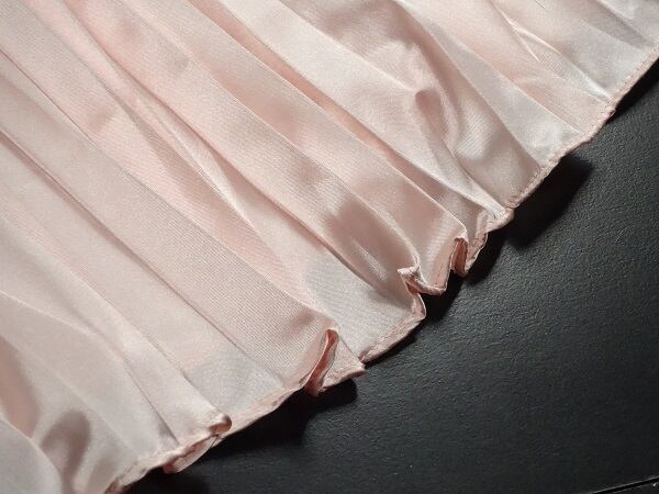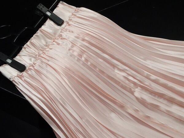 光沢メタリックピンクロングプリ-ツスカ-トです。しわになりにくく動くたびに揺れるエレガントなプリ-ツスカ-トです。ファスナ-なし(ウエストゴム仕様)。裏地有。