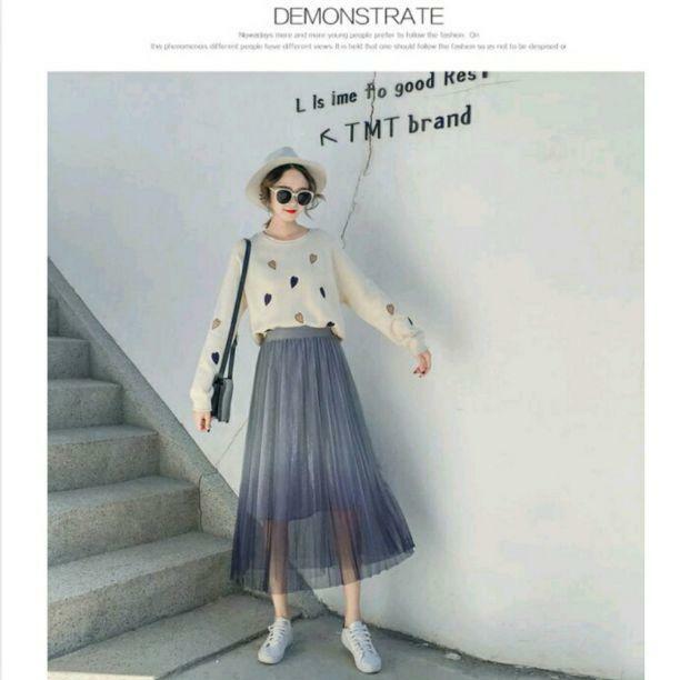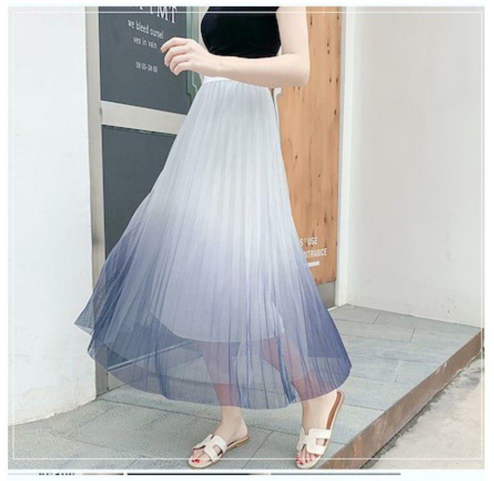 グレ-とパープルのグラデーションシフォンプリ-ツロングスカ-トです。グラデーションがとても綺麗でシフォンが歩くたびにふんわりと揺れる魅力的なシルエット。リゾートコーデにも最適です!ウエストゴム仕様で伸縮性あり。裏地付。
