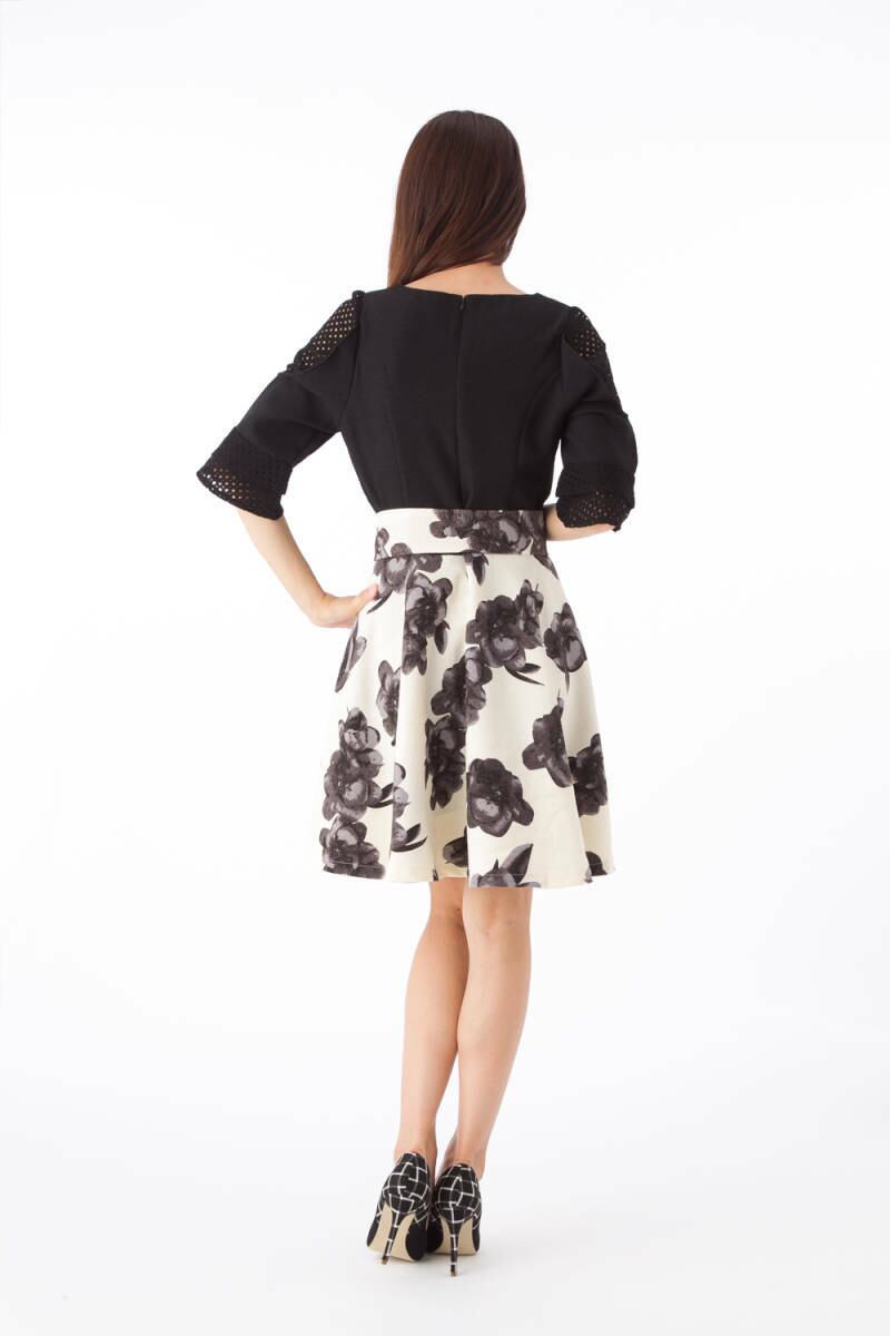 とても優美かつ綺麗な膝丈フレア-ワンピ-スです。ウエストから裾にかけてはたっぷりと生地を使用したフレア。袖のレ-スが女性らしいエレガントでフェミニンな一着です。背中ファスナ-有。裏地付。リボンベルト付。