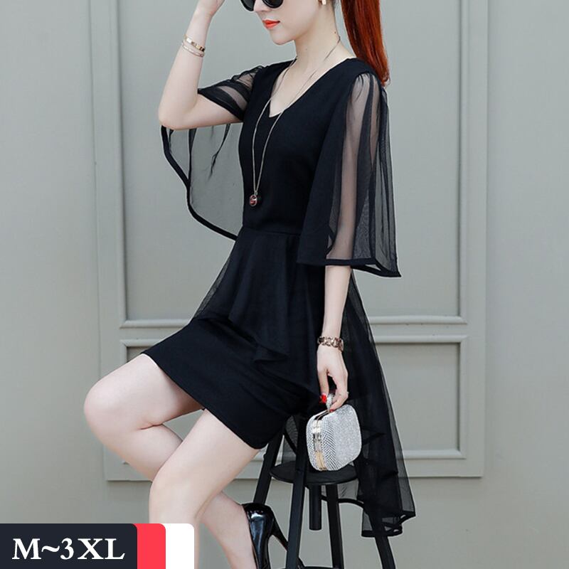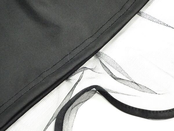 五分袖ネットチュールが美しいワンピースです。黒のつるっとした生地にネットチュ-ルが被せられた美しいデザインです。袖はフレア-になっていてとてもエレガントかつセクシ-なワンピ-スです。デートやちょっとした御呼ばれなど、フォーマルなシーンにも活躍してくれる一着です。ファスナーなし(かぶるタイプ)。裏地なし。