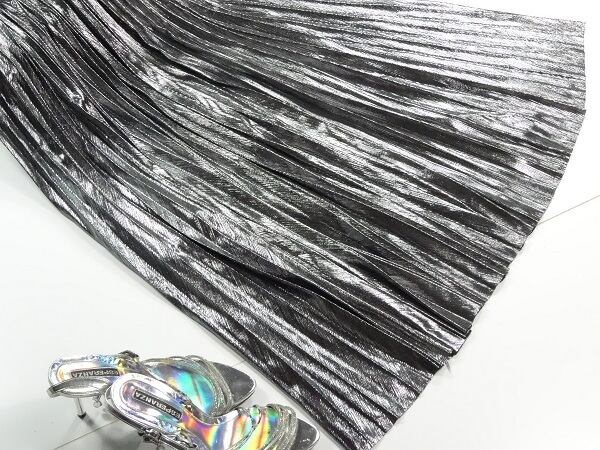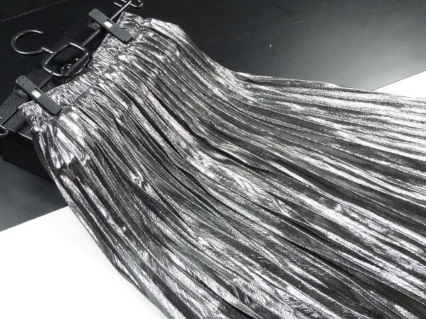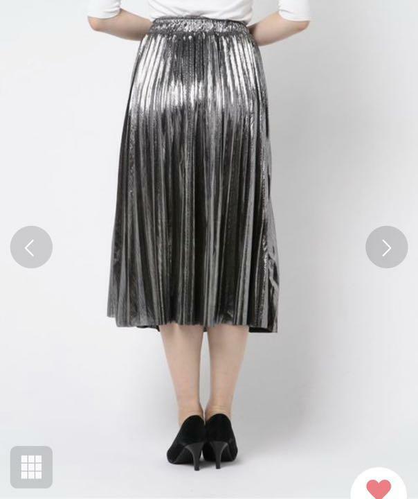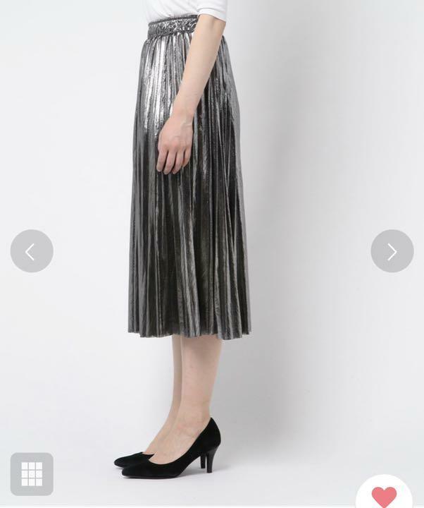 メタリックシルバ-の光沢プリ-ツスカ-トです。光沢の輝きがとても綺麗で歩くたびの揺れ感がプリ-ツならではでとても女性らしくまるで女優になった気分にさせてくれます。大人のエレガンスさを感じさせてくれるデザインです。裏地あり。