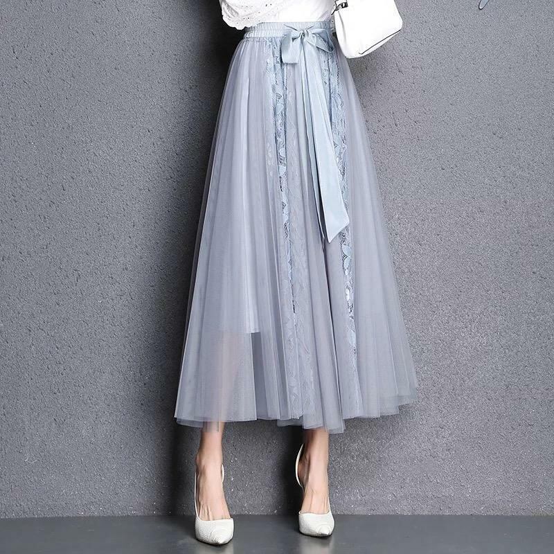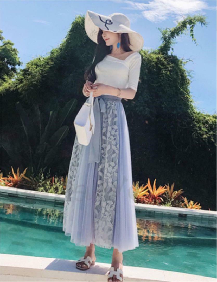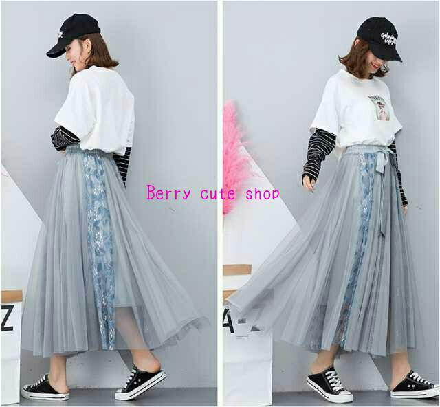 チュ-ルマキシ丈フレア-スカ-トです。前でリボンベルトを結ぶようになっています。生地が十分に使われていますのでエレガントで揺れ感も素敵です。ウエストは総ゴムです。裏地有。ファスナ-なし。
