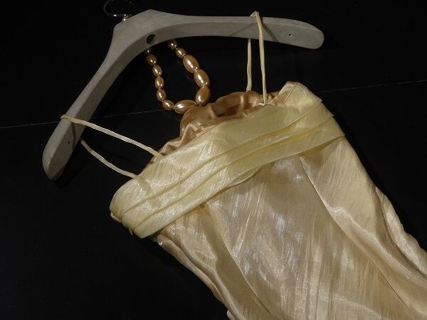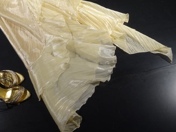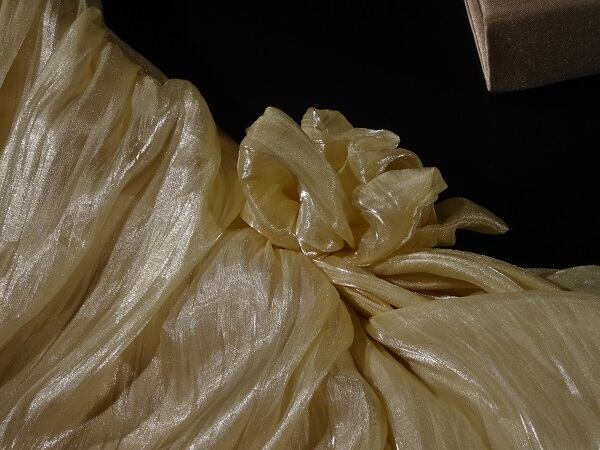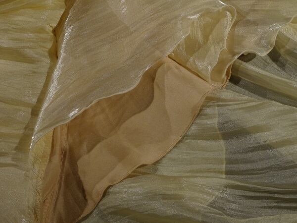 淡いオーガンジーシフォンフリルのドレス。胸元はドレープを重ね、斜めに切り返したウエストには大きなオーガンジー花のモチーフをアクセントに。光沢のあるつややかなイエローのオーガンジーをアンシンメトリーなフレアに仕立てエレガントに。豪華でフェミニンなデザイン。ほんのりとした透け感が上品な女性を表現してくれています。気になる方はインナー着用をお勧めします。パーティやイベント、コンサート、結婚式にと、さまざまシーンで活躍してくれる美しい一着。右脇下ファスナー。裏地付。