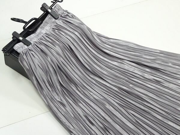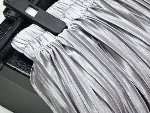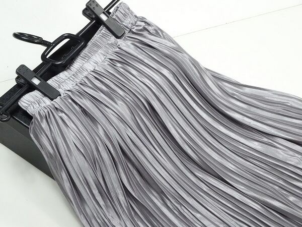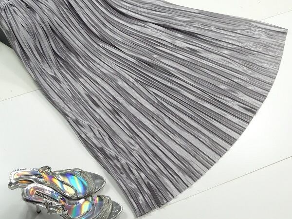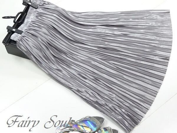 メタリックシルバ-の光沢プリ-ツスカ-トです。光沢の輝きがとても綺麗で歩くたびの揺れ感がプリ-ツならではでとても女性らしくまるで女優になった気分にさせてくれます。大人のエレガンスさを感じさせてくれるデザインです。裏地あり。ファスナ-なし(ゴム仕様)。