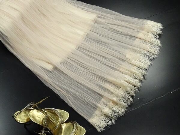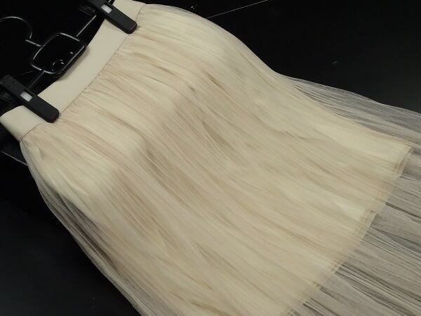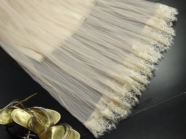 チュ-ルレースロングスカ-トです。細かチュ-ルプリ-ツを被せた柔らかな揺れ感が素敵です。履くだけで引き立つとてもファミニンなスカ-トです。レースの透け感と透けない部分が軽やかさを醸し出してくれてます。ウエストゴム仕様。ファスナ-なし。裏地有。