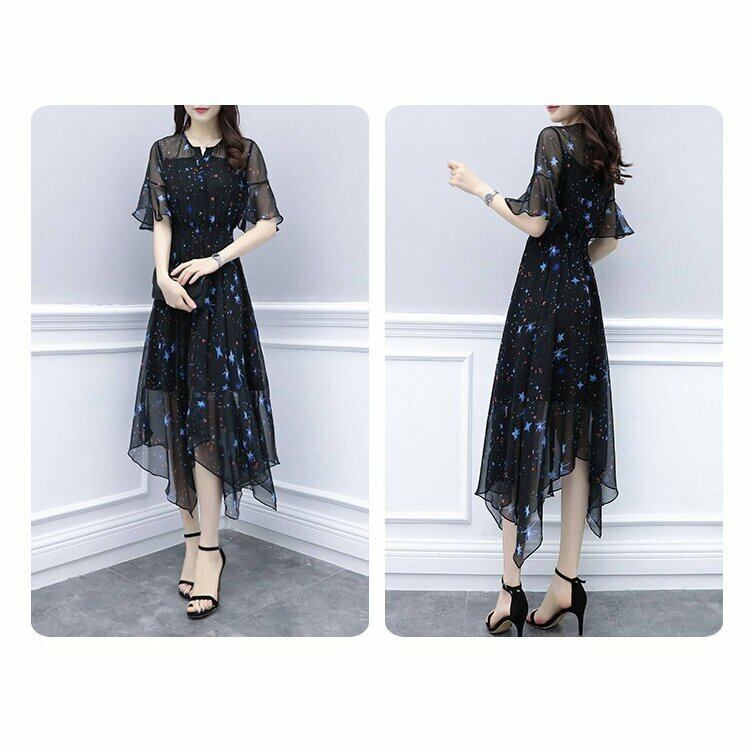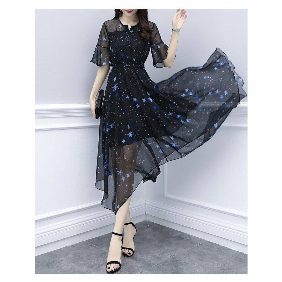 星柄アシンメトリ-ワンピース。ネイビ-地に落ち着いた色合いの星柄をプリント。透け感のあるしなやかな袖と裾が不規則なアシンメトリ-になっていてバランスが良く、軽やかでピュアでフェアリーなデザインになっています。煌めく太陽の光の中でも、また新緑の爽やかな風の中でも、着る人を美しく魅せてくれる一着です。裏地有り。ファスナ-なし(前ボタン)。