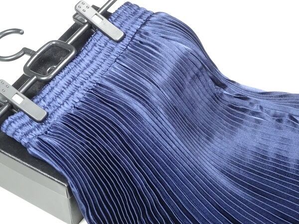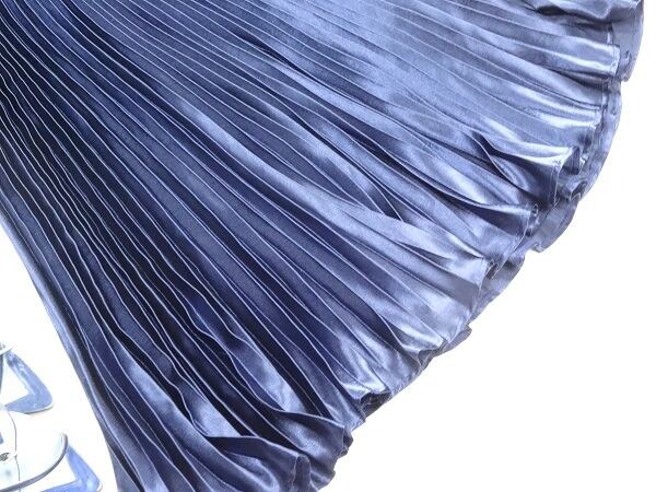 光沢メタリックネイビ-ロングプリ-ツスカ-トです。しわになりにくく動くたびに揺れるエレガントなプリ-ツスカ-トです。ファスナ-なし(ウエストゴム仕様)。裏地なし。