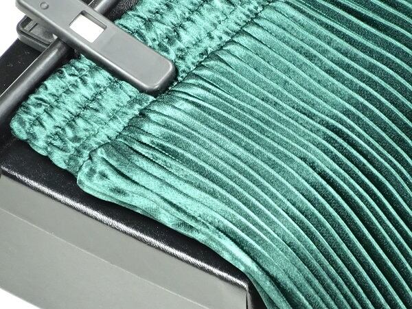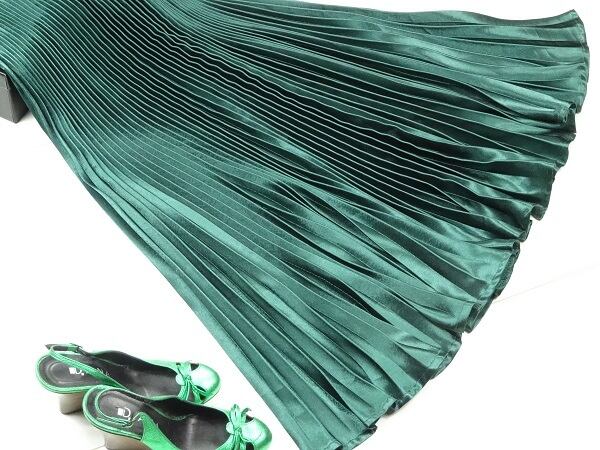 光沢メタリックグリ-ンロングプリ-ツスカ-トです。しわになりにくく動くたびに揺れるエレガントなプリ-ツスカ-トです。ファスナ-なし(ウエストゴム仕様)。裏地なし。