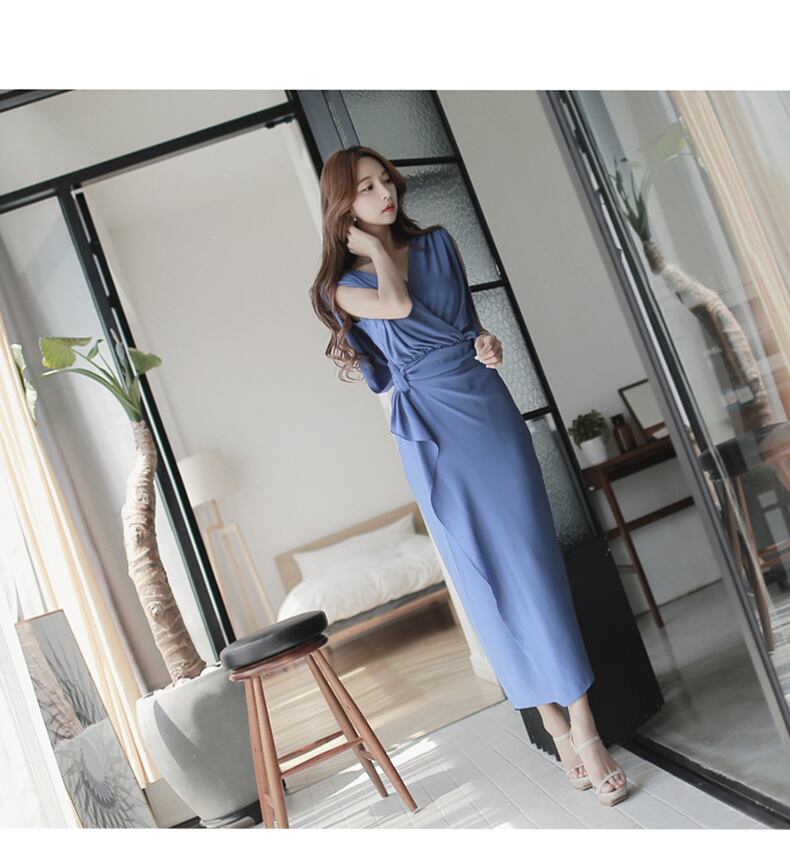 胸元ドレープスレンダーなロングドレス。青のしなやかな生地を胸元でゆったりとドレープをとり、ウエストできゅっと絞り、裾にかけて優しく流したスレンダーなデザイン。エレガントで上品な女性を表現してくれています。パーティやイベント、コンサート、結婚式にと、さまざまシーンで活躍してくれる美しい一着。右脇ファスナー有。裏地あり。