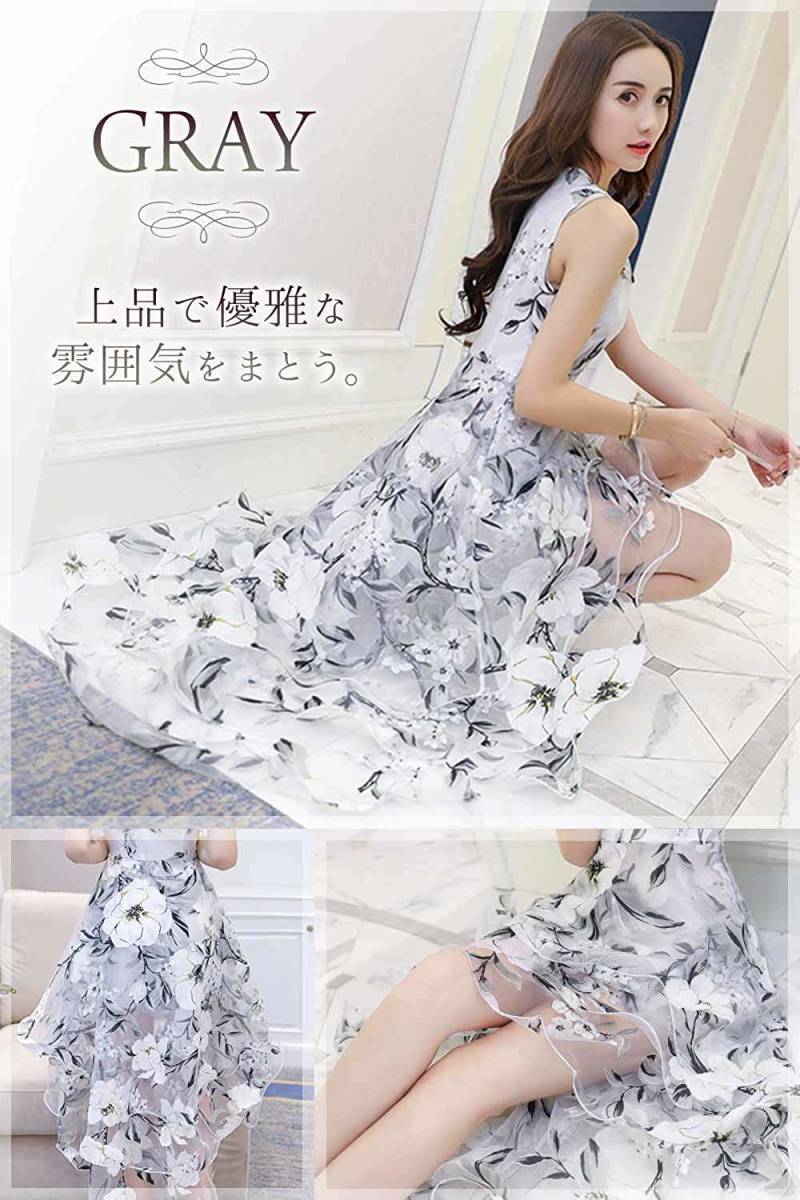 3段フリルフィッシュテ-ルワンピです。前が短く、後ろが長いフィッシュテ-ルタイプ。艶のあるサテンシフォンにシックなモノトーンの花柄をプリント。襟は浅いラウンドネックで袖はノースリーブ。3段のフリルの裾がひらひらと華やかで豪華な印象に。パーティやイベント、結婚式など、様々なシーンで、気品のある印象を与えてくれる一枚です。裏地有。右脇ファスナ-有。