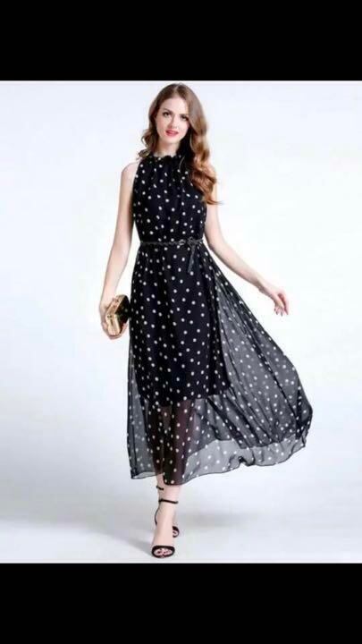 シンプルなシフォン水玉ロングワンピースです。生地をたっぷりととり、ゆったりとした中に優雅さを併せ持ったシルエットになっています。シンプルなスタイルですので、ベルトやアクセサリー、羽織物などで様々なコーディネートを楽しんで頂けます。裏地付。ベルト付。
