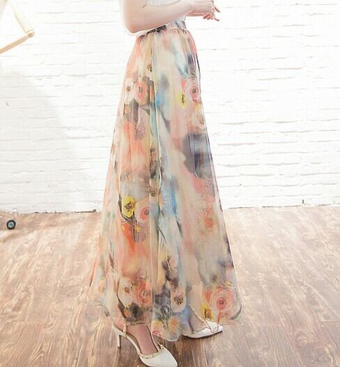 花柄プリントシフォンフレア-スカ-トです。とても美しい花柄プリント模様のシフォンが歩くたびにふんわりと揺れる魅力的なシルエット。リゾートコーデにも最適です!ウエストゴム仕様で伸縮性あり。裏地付。