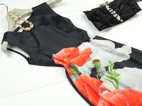 黒色を基調とした赤と緑の花柄プリントがとても美しいワンピースです。花模様が全体を綺麗なバランスにまとめています。後ろの裾の中央部は13cmスリットになっています。背中ファスナー有。裏地なし。