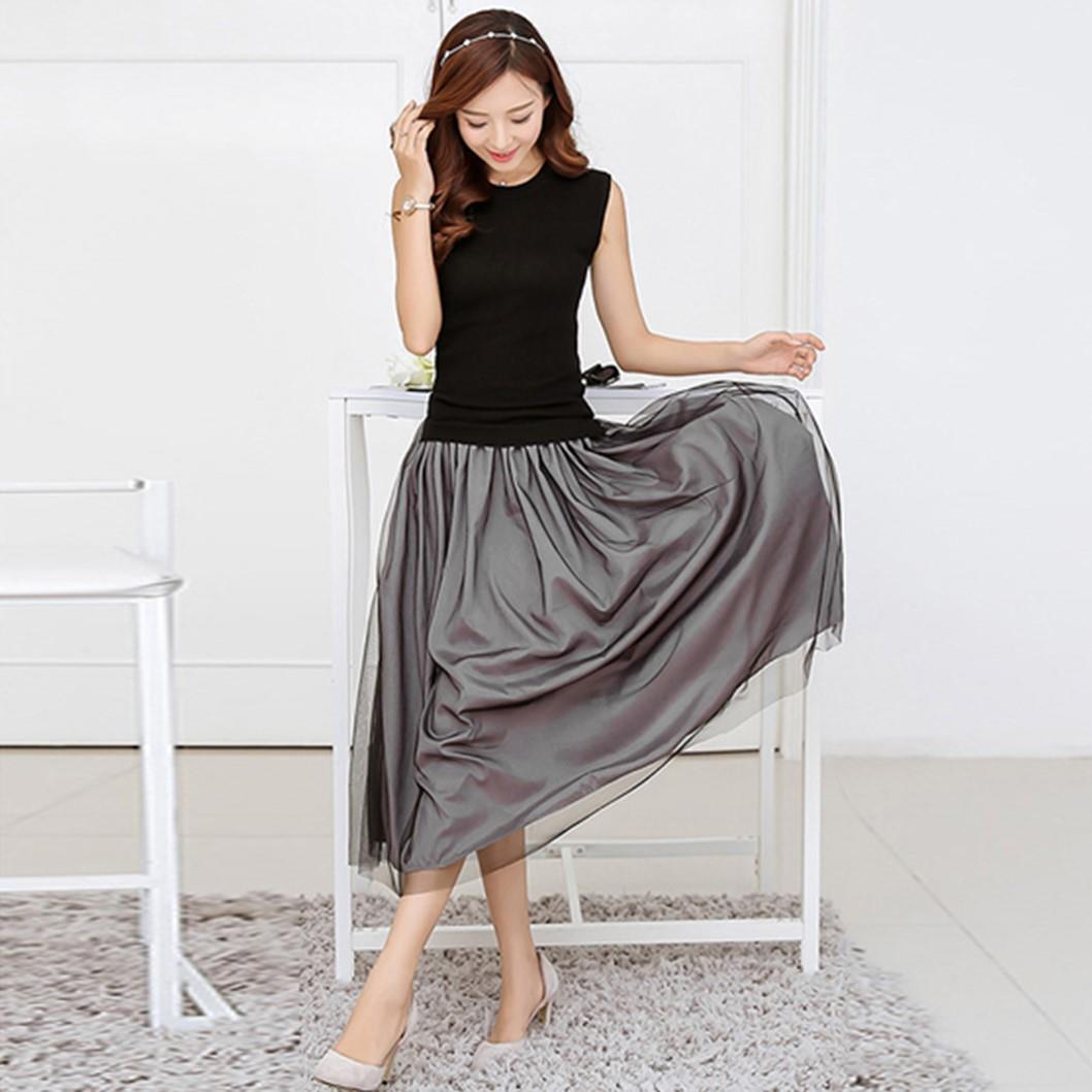 リブ編みチュール重ねのワンピ-ス。トップス部分はリブ編み仕様で、ウエストに切替が入っています。スカートはグレーのジャージ素材で上に黒のネットチュールを被せています。伸縮性もあり、着心地の良い一着です。ファスナーなしのかぶるタイプ。裏地なし。