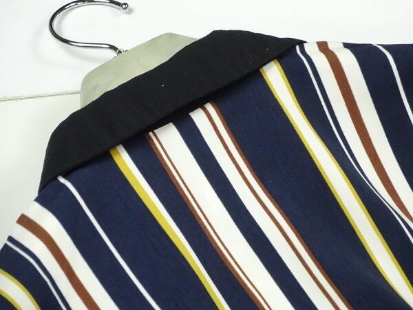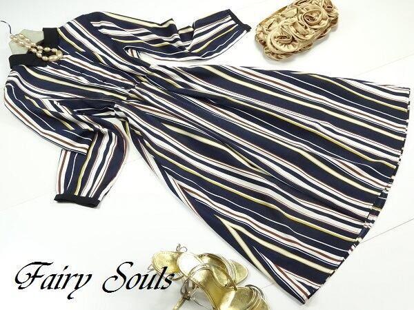 ストライプ前ボタン留めマキシ丈ワンピースです。やわらかなシフォン地に、ネイビ-、シブラウン、イエロ-、白でストライプをプリント。前ウエストまでをボタン留め。シックで上品な女性を表現してくれています。パーティやイベント、コンサート、結婚式にと、さまざまシーンで活躍してくれる大人の一着です。ファスナーなし。裏地有。